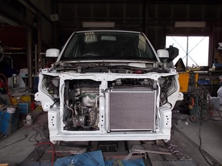 ▼ 作業開始前の解体作業でラジエターモール、ラジエター、クーラーコンデンサ、エンジンルーム内の部品を取り外します。変形したラジエターモールを取り換え部品の脱着が出来るようにしています。